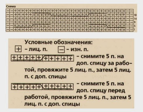 - рельеф: 1р.:1кр., 3изн., *2л.,6и.* – повтор от * и до * дважды, коса по схеме, *6и.,2л.* – повтор от * и до * дважды,3и., 1кр.; 2р. и все четные – по рисунку.