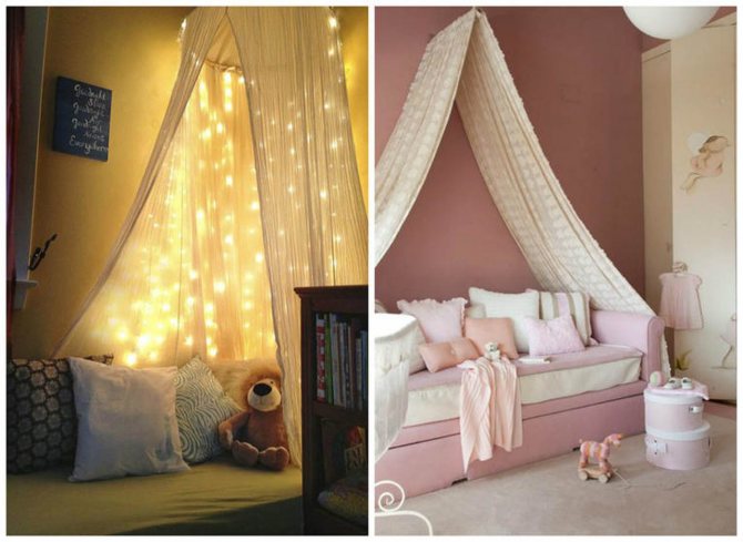 Накидка без отделки над тем местом, где спит ребенок, будет смотреться скучно. Выше описано много способов украшения балдахина своими руками, в которых использовались: