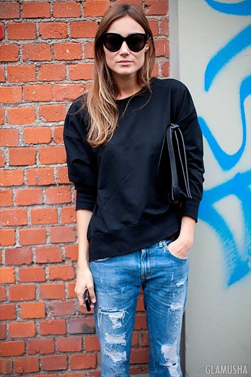 Джинсы можно носить с обычной гладкой сорочкой. Но она может быть и шелковая или прозрачная, полностью, или отдельные ее части — рукава, воротничок. Могут на ней присутствовать и декоративные элементы: рюши, аппликации из камней, кружевные вставки, белая отделка. В таких случаях важно не перегрузить образ различными украшениями. Можно использовать еще одну деталь с замысловатой отделкой, а все остальное должно быть предельно простым.