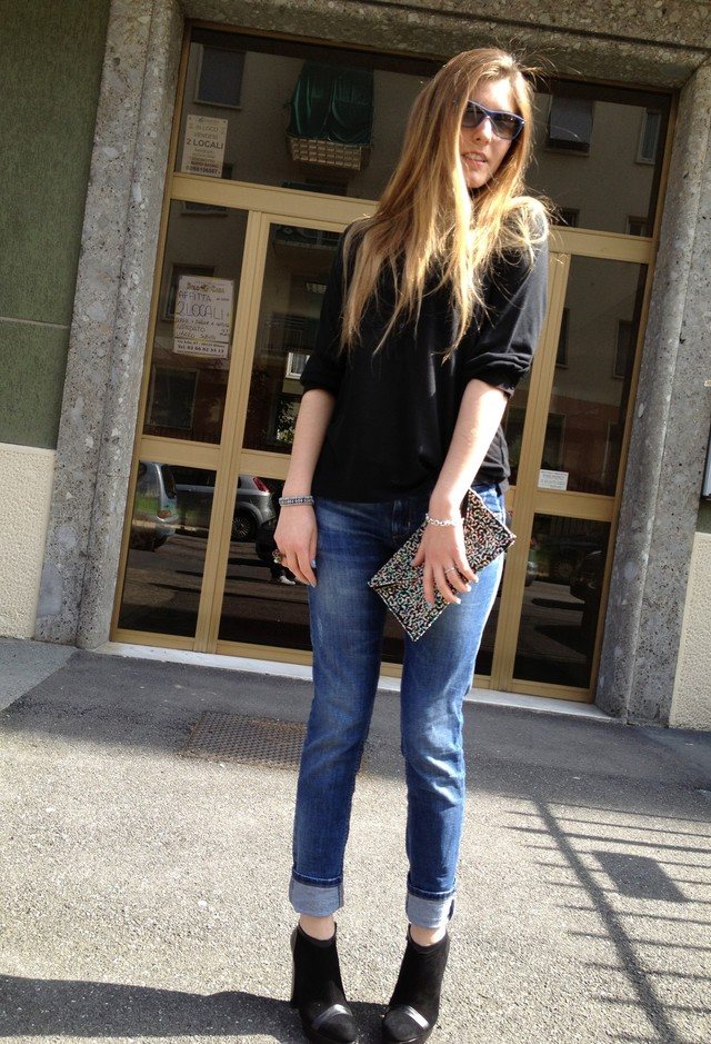 Например, в случае, если модница любит леопардовый принт. Интересно будет выглядеть такой комплект: чёрная прозрачная блуза с синими джинсами, ботильоны и сумочка с леопардовым рисунком. Особенно хорошо получится, если блузку заправить в джинсы, а талию подчеркнуть ремнем.