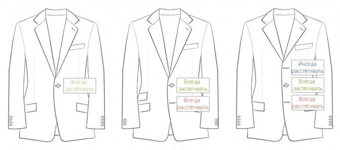 — пиджак носится застёгнутым на все пуговицы, лишь в положении сидя нижнюю пуговицу можно расстегнуть, чтобы избежать деформации полочек