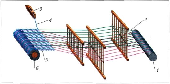 Рис. 10. Процесс изготовления ткани на ткацком станке: 1 — навой; 2 — нити основы; 3 — челнок; 4 — нити утка; 5 — кромка; 6 — товарный валик