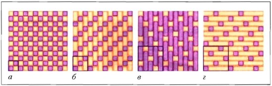 Рис. 11. Ткацкие переплетения: а — полотняное; б — саржевое; в — сатиновое; г — атласное. Выделенные участки — раппорт