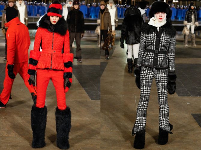 Все же такого эксцентричного образа модельерам Монклер показалось мало. Следующую модель лыжного костюма они представили в принте «пье-де-пуль». Гусиная лапка изумительно сочеталась с меховой шапкой и варежками угольного оттенка.