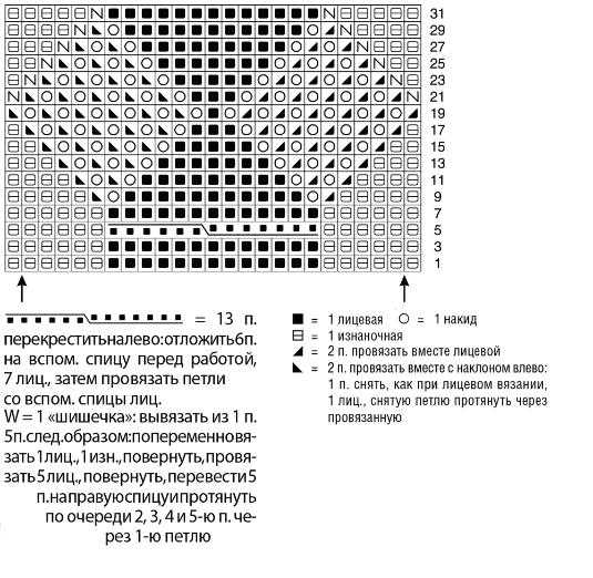 Вязать согл. схеме. На ней даны лицевые и изнаночные ряды. Раппорт и 1–6-й ряды постоянно повторять.