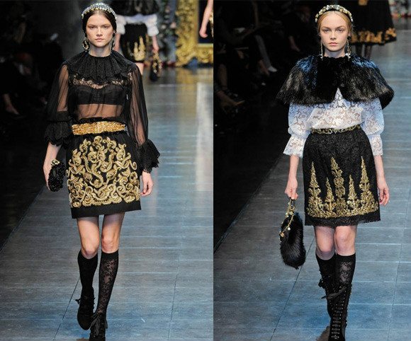 Если вы хотите выглядеть модно и в тренде, выбирайте только один или два акцента в данном стиле, как это делает в своих коллекциях Дольче и Габбана. Можно отдать предпочтение черному бархатному платью с крупными золотыми украшениями. Или выбирайте бархатное изумрудное платье в пол с золотым узором. Все зависит от места, куда вы хотите пойти.