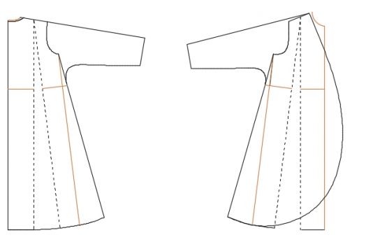 Разложите выкройки спинки и переда на листе бумаги, обведите их и при необходимости откорректируйте длину пеньюара. Спинка.