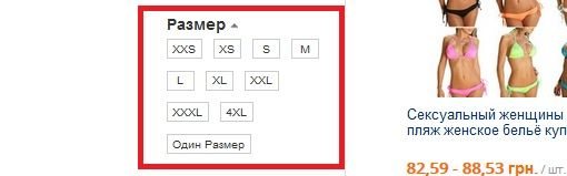 Найдите фильтр и выставите необходимы параметры – это цвет, цена, рейтинг продавца и другие. Теперь посмотрите фильтр – размер купальника: