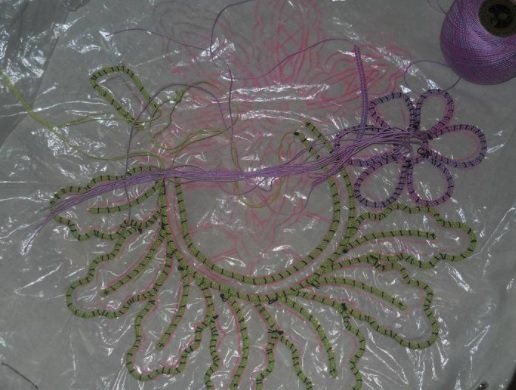 Выложенные по шаблону шнуры закрепляют на тканевой основе и приступают к узорной обвязке по выбранной схеме. Готовое изделие отсоединяют от макета.