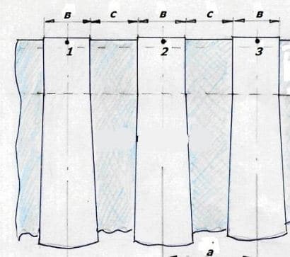 Рисунок 3. — схема бантовой складки 1 к 3, т.е. ткани в три раза больше готовой ширины шторы. а — ширина банта b = 0.