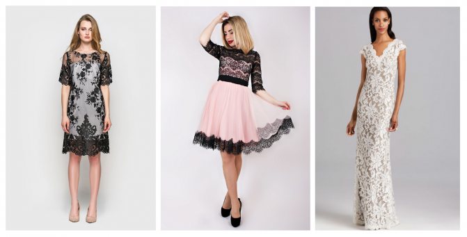 - Вечерние и повседневные платья. Из кружева могут быть выполнены отдельные детали (рукава, спинка). Если гипюр используется в качестве основной ткани, то его «сажают» на непрозрачную подкладку, чтобы наряд не получился чрезмерно откровенным.
