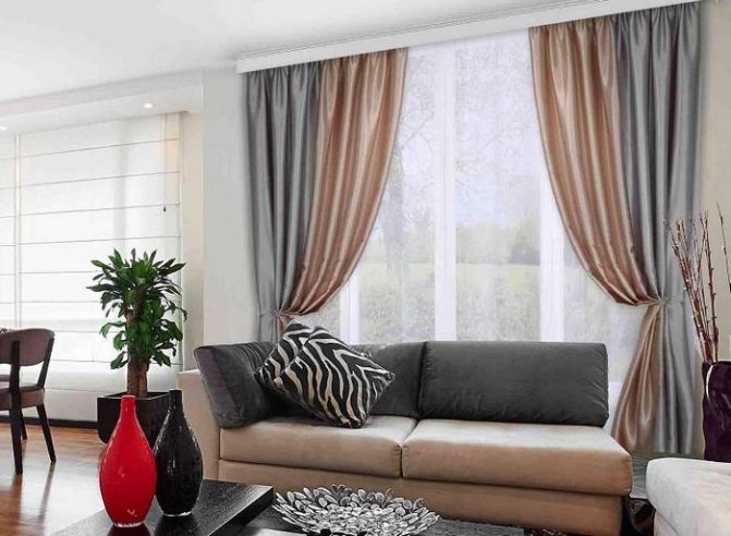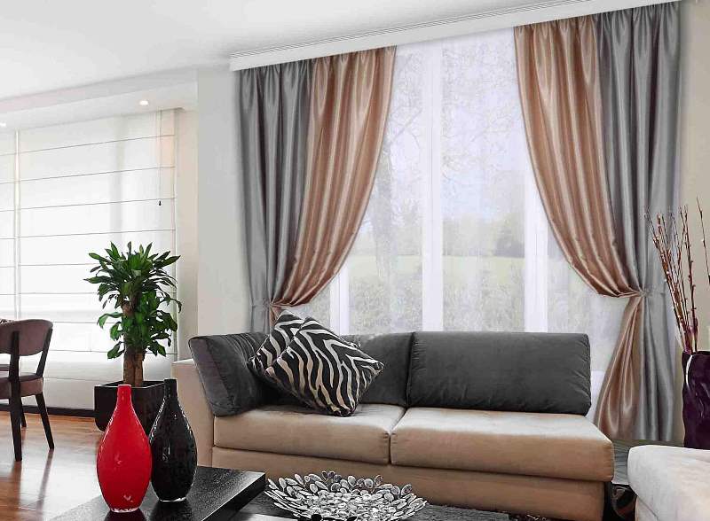 Шторы шанзелизе комби – комплект из двух портьер разного цвета. Это удачное решение для дизайна гостиных или спален. Их легко задрапировать, сочетая матовую и атласную фактуру.