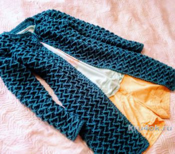 Изделие в меру облегает силуэт, отлично держит форму и придает женственность образу. Большой популярностью пользуется , изготовленный из пряжи разного состава и плотности. Используют плотные нити из натуральной шерсти с добавлением акрила, полиэстера и хлопка, а также , с небольшой добавкой нейлона или эластана. Модульное вязание и поэтапная сборка позволит получить стильную вещь в форме «кокон», которая украсит любую женщину.