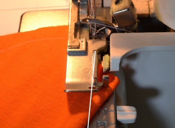 Выполняют при помощи крайней иглы оверлока, оставляя хвост нитки длиной 7 см. Он необходим, чтобы закрепить ее. Протянув сквозь шов с помощью иголки.