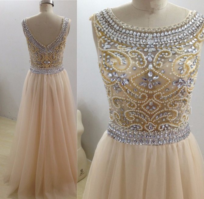 Украшения бусинами и бисером подходят не только для однотонных платьев, ими всегда можно расшить узор на ткани. А на однотонных платьях очень необычно смотрятся крупные стразы и бусины в хаотичном порядке. Четкой инструкции, как правильно украсить платье бусинами нет, все зависит от фантазии и материалов.