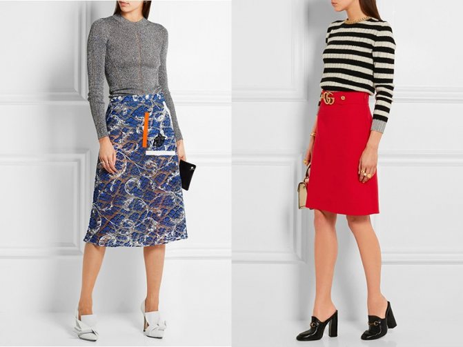 Ниже колена оптимально смотрится в ретро-стиле. Украшает любую форму ног, допустимо надевать при проблемных зонах бедер и талии. Осенние юбки по колено формируют женственный силуэт с лофферами, ботильонами и ботинками на большой платформе, а летние — с балетками или туфлями на танкетке, толстом каблуке.