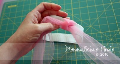 5. Возьмите две полосы ткани и обвяжите их вокруг резинки следующим образом: — один простой узел
